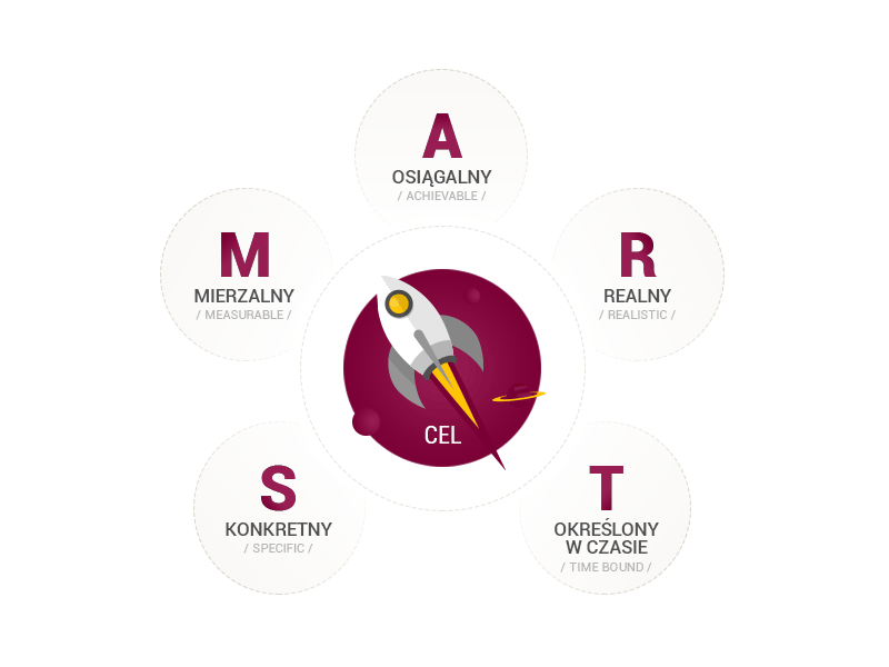 Nazwa S.M.A.R.T. wywodzi się od pierwszych liter angielskich słów: Specific (konkretny), Measurable (mierzalny), Achievable (osiągalny), Realistic (realny) i Time-bound (określony w czasie). W tych słowach ukryty jest klucz do prawidłowego wyznaczania swoich celów. Dlaczego ustalenie sobie celu „chcę być bogaty” jest nieprawidłowe? Odpowiedzmy sobie na następujące pytania:
