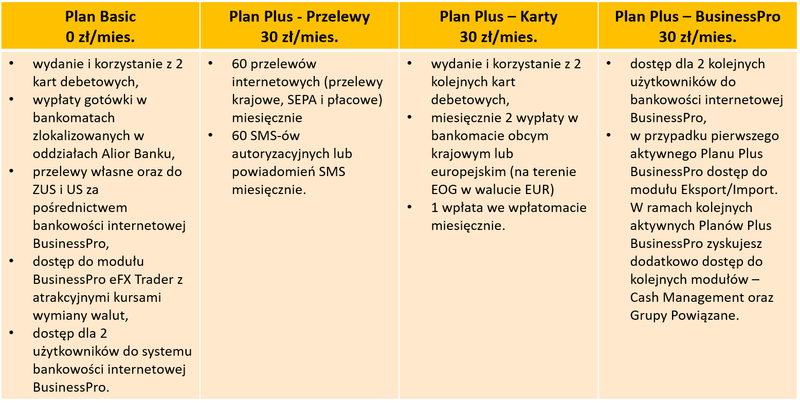 Plany Plus to pakiety bezpłatnych usług udostępnianych w formie abonamentu w wysokości 30 zł miesięcznie za każdy Plan Plus, które możesz włączać i wyłączać w dowolnym momencie – zarówno w placówce banku, jak i samodzielnie w bankowości internetowej BusinessPro. Z usług udostępnionych w poszczególnych Planach Plus korzystasz bez dodatkowych opłat.
