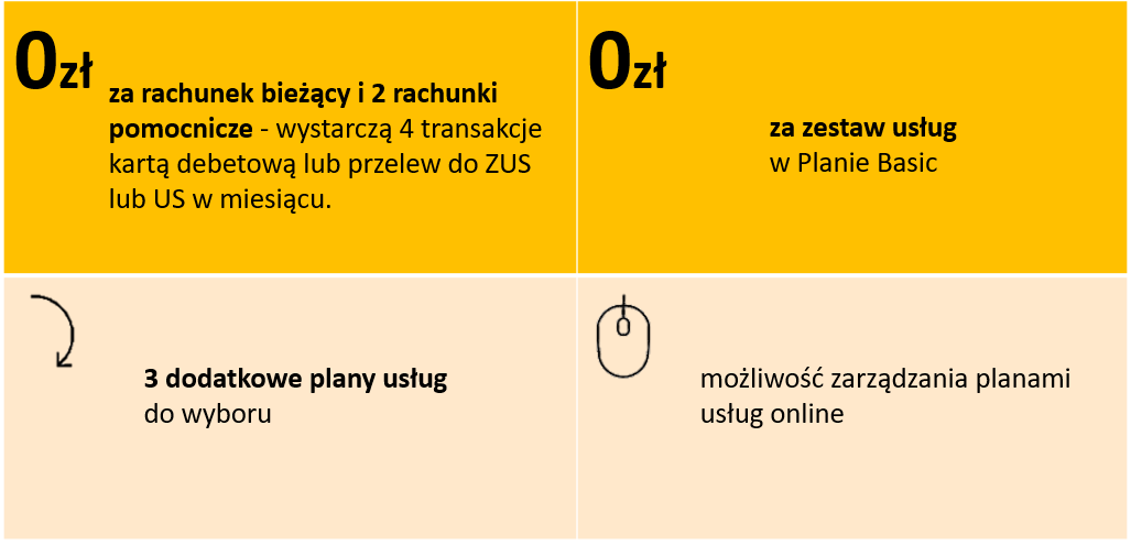 Bezpłatne prowadzenie rachunku podstawowego oraz 2 dowolnych rachunków pomocniczych (jeśli klient korzysta z rachunków pomocniczych) dotyczy przypadku, gdy klient spełni jeden z dwóch warunków: w danym miesiącu kalendarzowym (do godz. 21.00 ostatniego dnia miesiąca kalendarzowego) dokona łącznie minimum 4 transakcji bezgotówkowych przynajmniej jedną kartą debetową wydaną do rachunku podstawowego lub pomocniczego (nie dotyczy Karty Wirtualnej) albo wykona przelew do ZUS lub US (nie dotyczy realizacji przelewów za pośrednictwem zleceń stałych oraz przelewów natychmiastowych). Opłata nie jest pobierana w miesiącu, w którym otwarto rachunek. Opłata za Plan Karty, Plan Przelewy, Plan BusinessPro wynosi 30 zł miesięcznie za każdy plan.